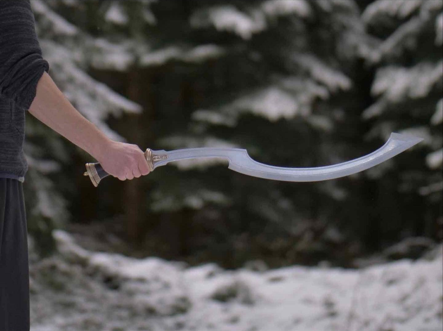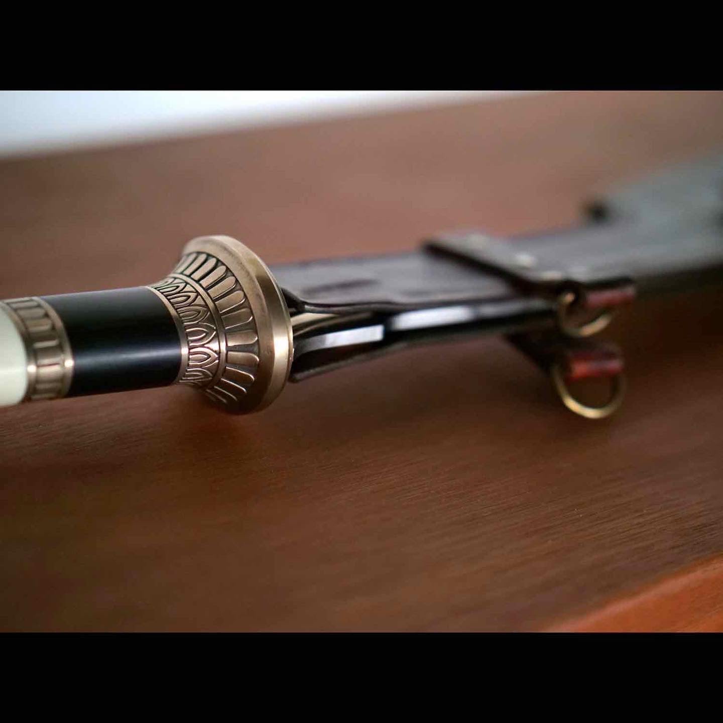 The split sheath takes inspiration from examples of Chinese sabre sheaths such as those used by some infantrymen during the boxer rebellion, which accommodated curved blades that widen through the belly towards the tip. For a blade profile as
