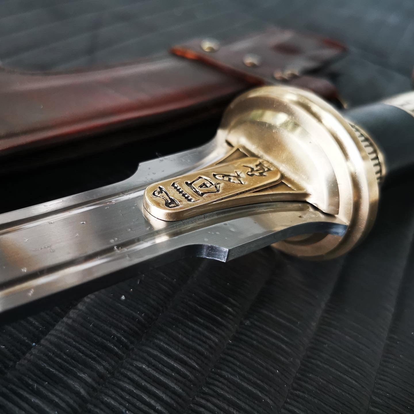 The hilt consists of a sandwich of bronze guard, pommel and spacers with two pieces of African Blackwood and one section of deer antler in the centre. The bronze castings are adorned with classic Egyptian patterns, sketched by Joël and then modelled in a CAD program, before being resin 3D printed as patterns for casting using the lost wax method. The bronze cartouche which extends up the base of the blade from the hilt carries Joël's name in hieroglyphics. It was cast as a separate piece and then brazed onto the top of the guard.