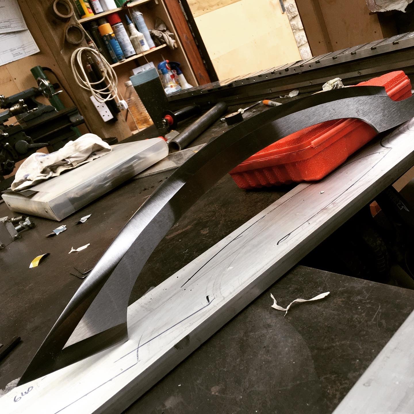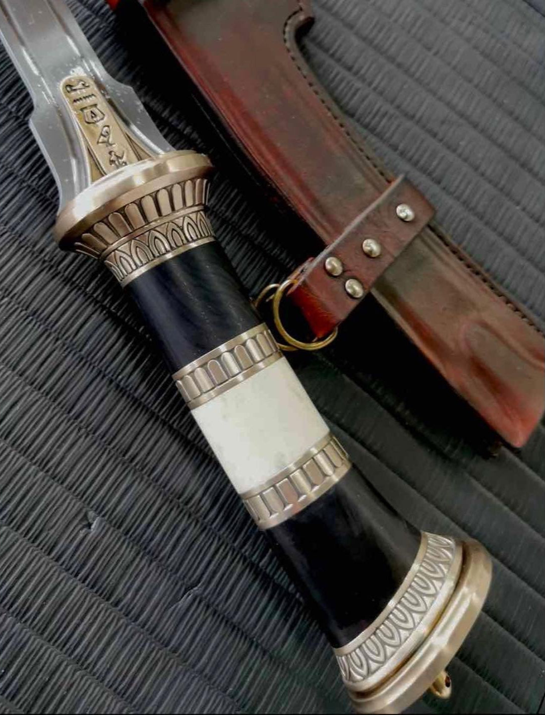 The blade, based on historical examples from the Egyptian New Kingdom era (1550 to 1069 B.C.) was hand forged from en45 spring steel, hardened and drawn back to a spring temper. It was then distal tapered across its length and bevels ground on the belly and back edge of the tip. The fullers, which follow the lines of the blade profile, were hand carved using a custom carbide scraper, not dissimilar to those used for carving the fullers in Katana.